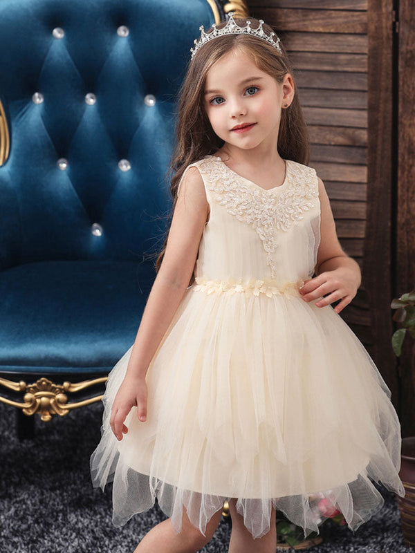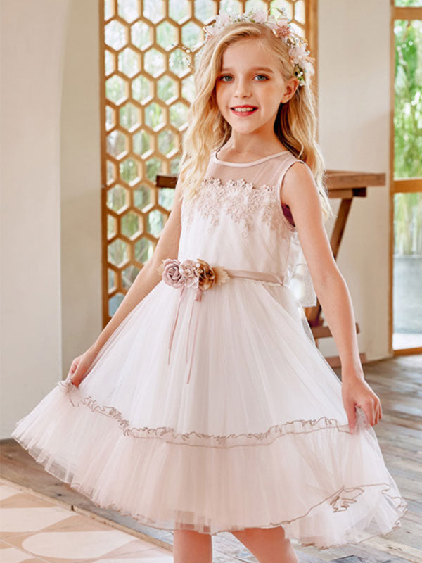 Champagne Jewel Neck Sleeveless Polyester Lace Tulle Flowers Kids Social Party Dresses