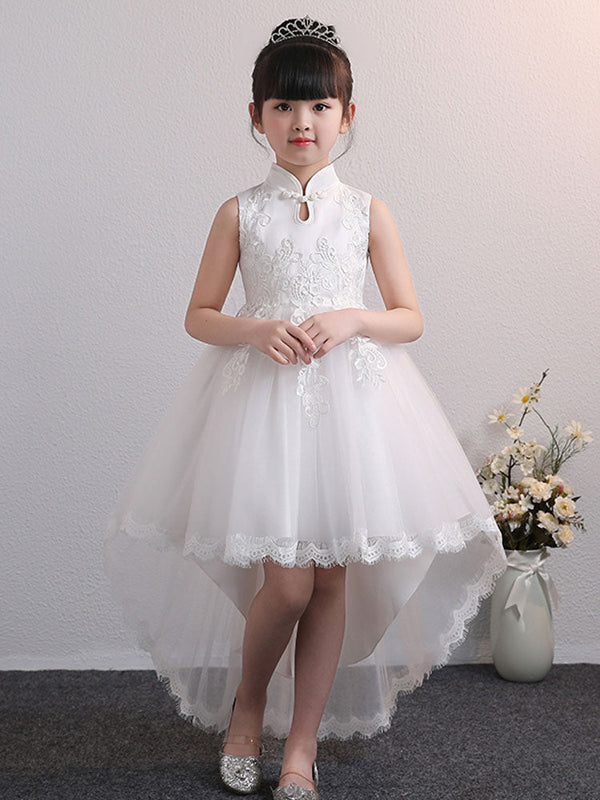 Designed Neckline Tulle Sleeveless Short High Low Princess Embroidered Kids Party Dresses