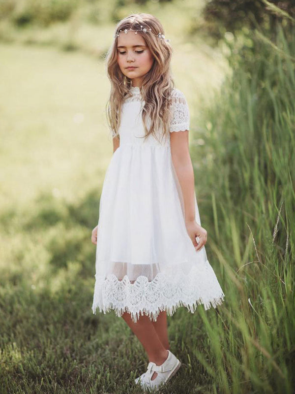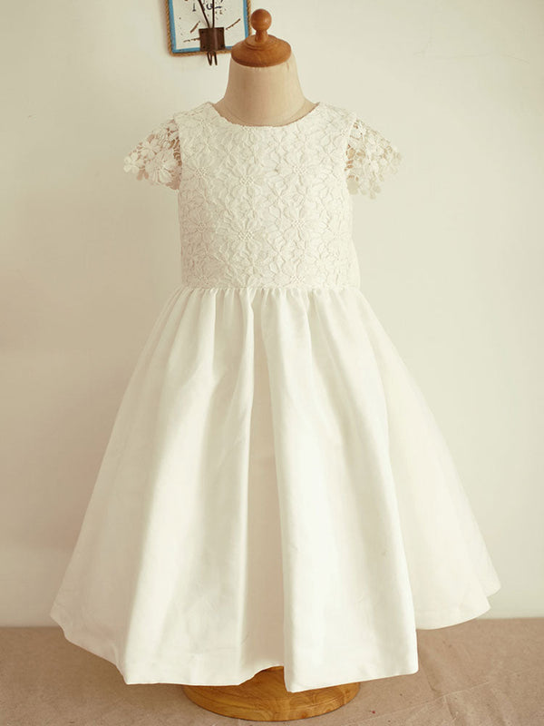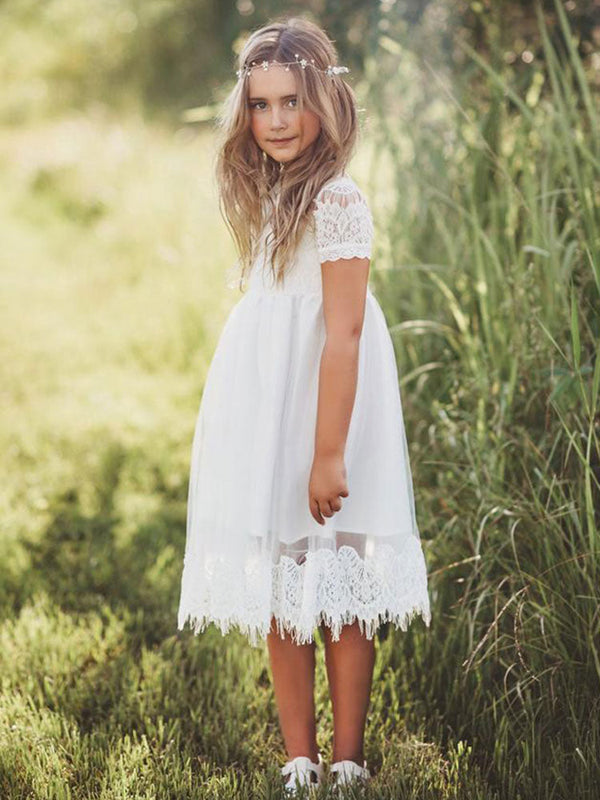 Ivory Jewel Neck Short Sleeves Lace Formal Kids Pageant flower girl dresses