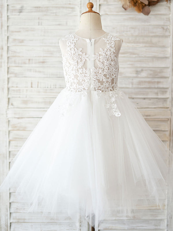 White A-Line Zipper V-Neck Sleeveless Tulle Flowers Kids Party Dresses