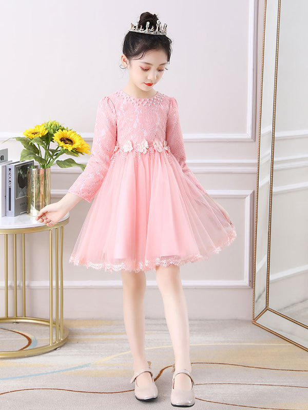 Light Pink Jewel Neck Long Sleeves Beaded Tulle Lace Kids Social Party Dresses