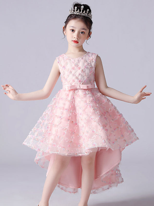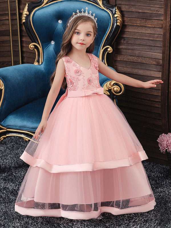 Pink Jewel Neck Sleeveless Bows Formal Kids Pageant flower girl dressesLace Princess Dress