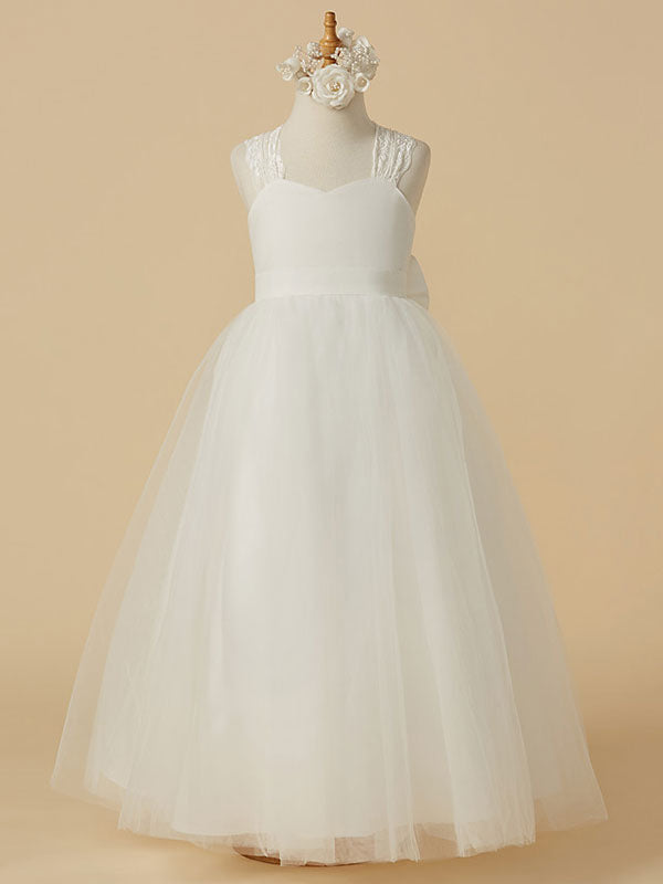 Jewel Neck Tulle Short Sleeves Floor Length Princess Bows Kids Formal Pageant Dresses