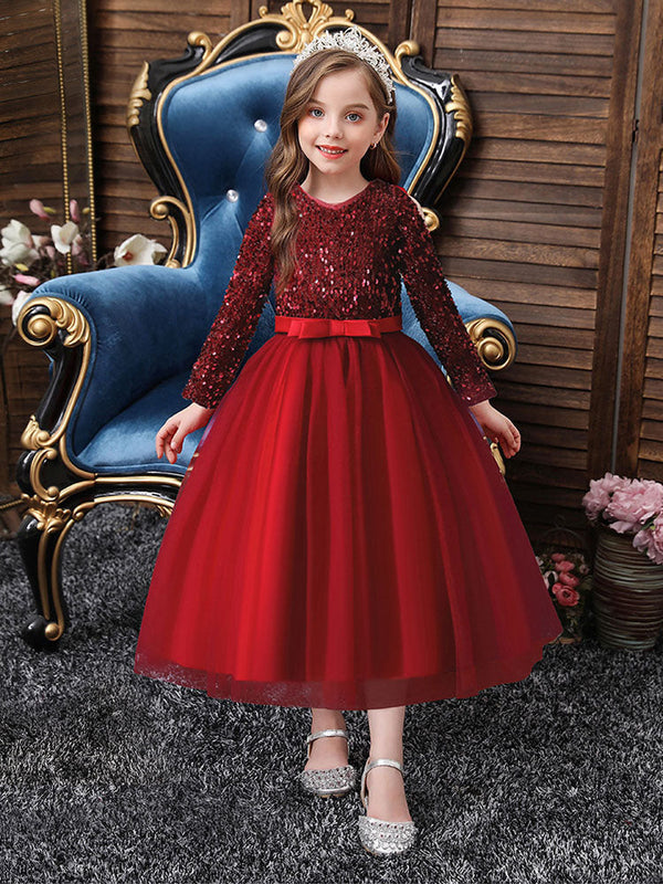 V-Neck Tulle Long Sleeves Ankle-Length A-Line Bows Burgundy Kids Social Party Dresses