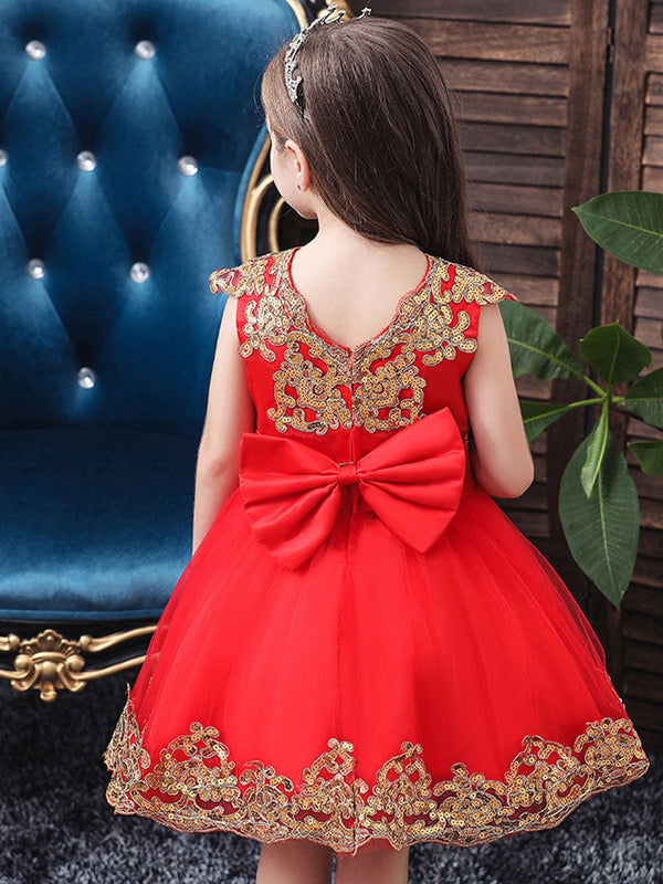Jewel Neck Polyester Sleeveless Short Princess Bows Kids Social Party Dresses