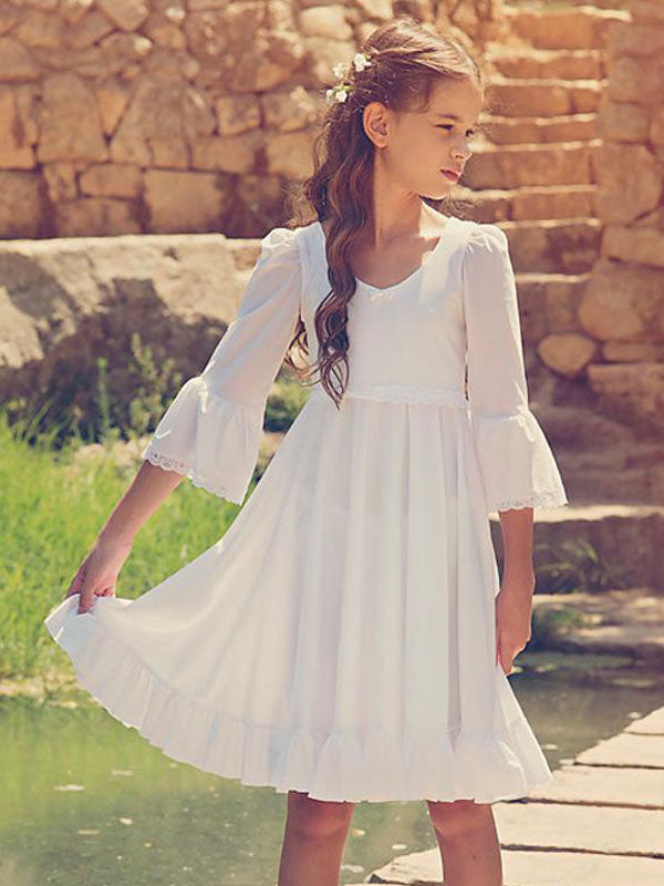 White V-Neck Lace Short Sleeves Floor-Length A-Line Applique Kids Social Party Dresses