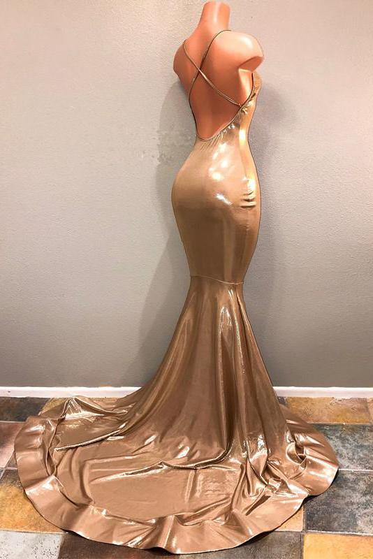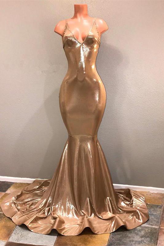 Chic Spaghetti-Straps Gold Prom Dress, Sleeveless Formal Dresses