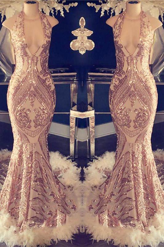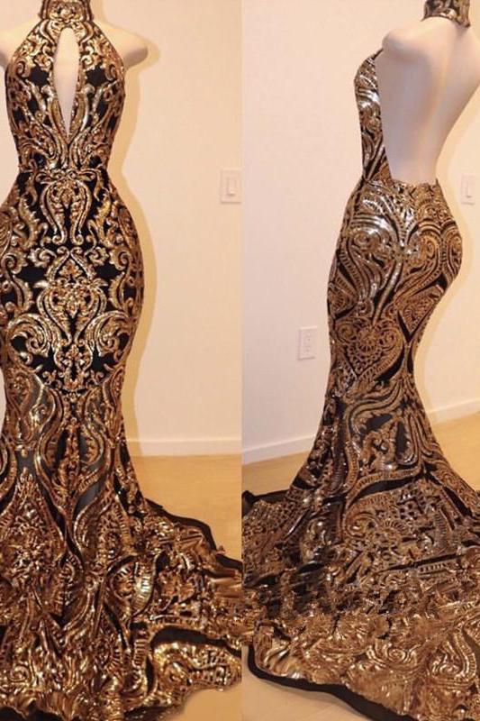 Sexy V-Neck Halter Backless Mermaid Prom Dress Gold Sequins Long Backless