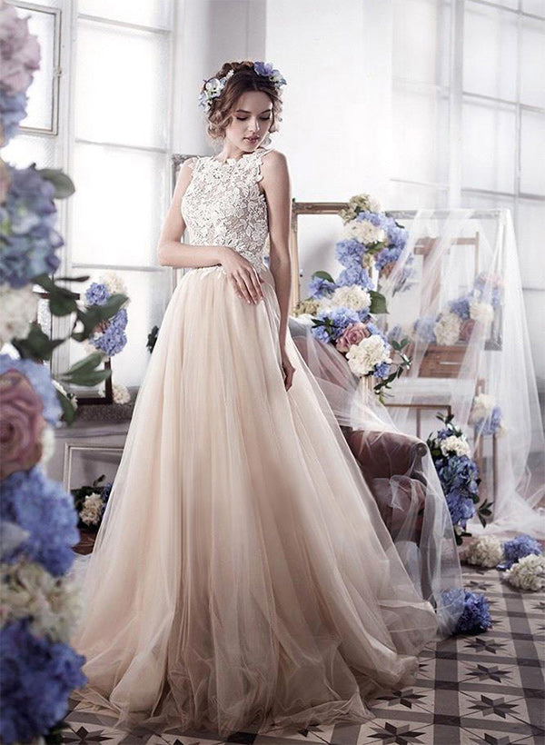 Chic A-line Tulle Scoop Neck Sweep Train Covered Button Wedding Dress Lace