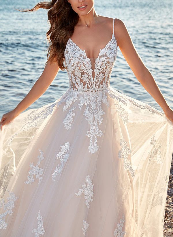 Chic A-line V-Neck Sweep Train Tulle Bridal Gown