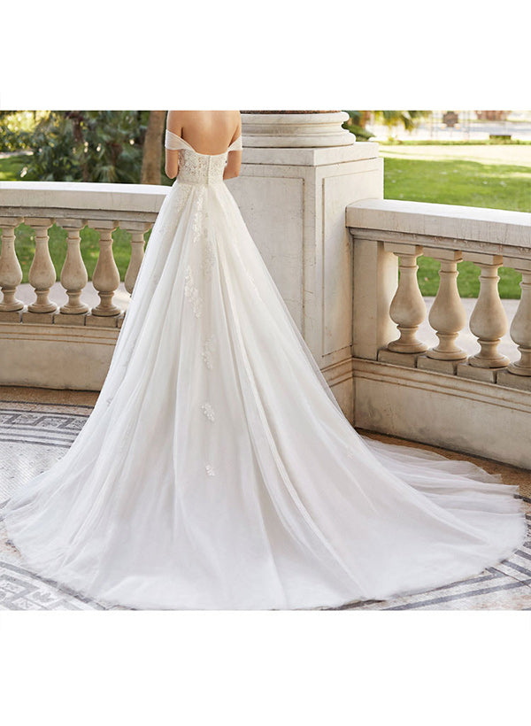 Off-The-Shoulder Ball-Gown Wedding Dresses Short Sleeves Tulle Lace Appliques