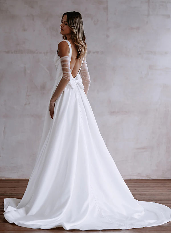 Satin Wedding Dress Chic A-line Square Neckline Sleeveless Court Train Split Front
