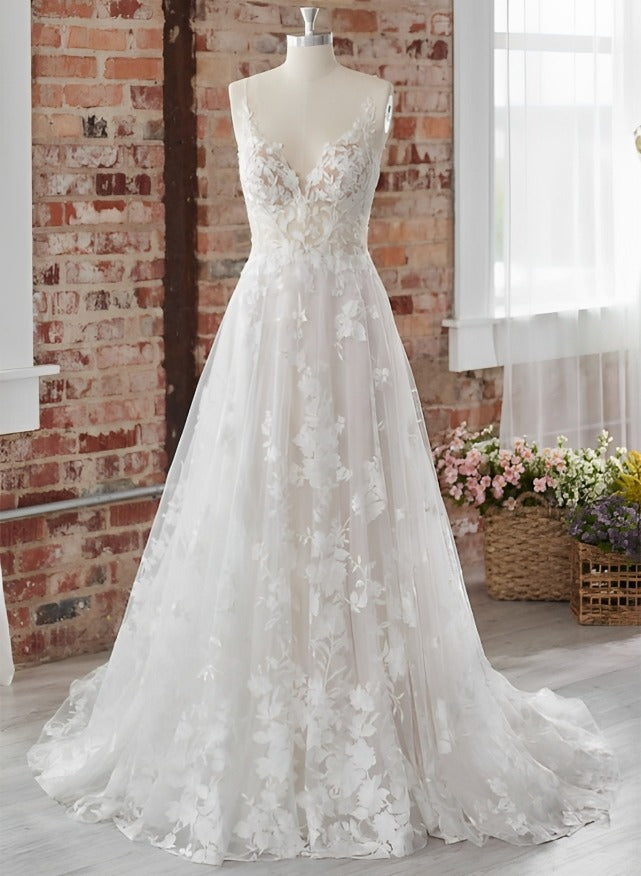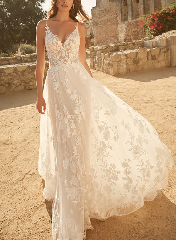 Sleeveless Lace Wedding Dresses Chic A-line V-Neck Sweep Train