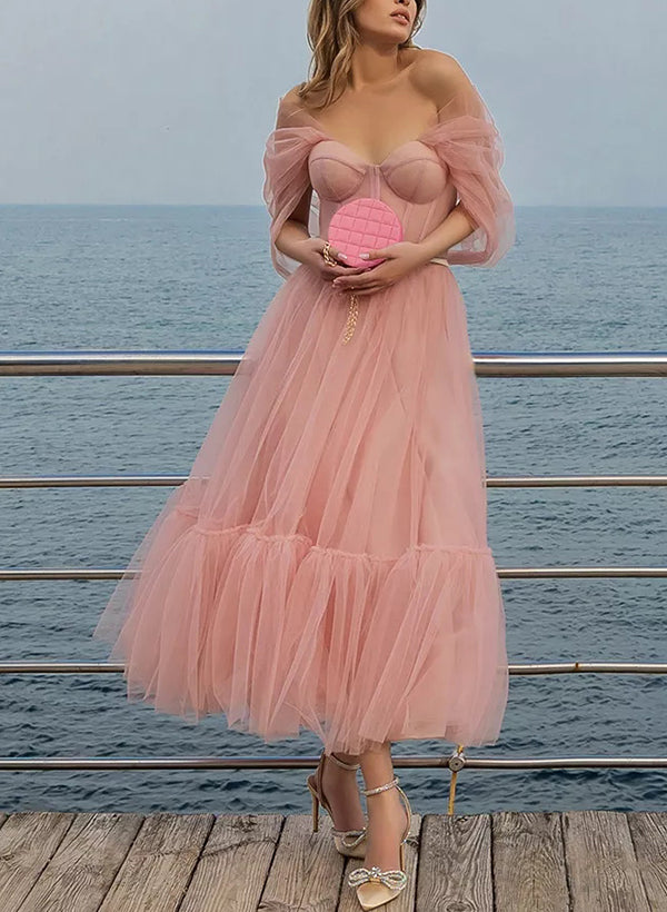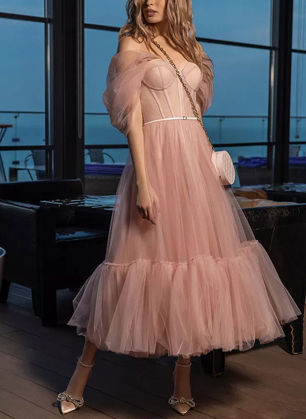 A-Line Sweetheart Sleeveless Tea-Length Tulle Homecoming Dresses