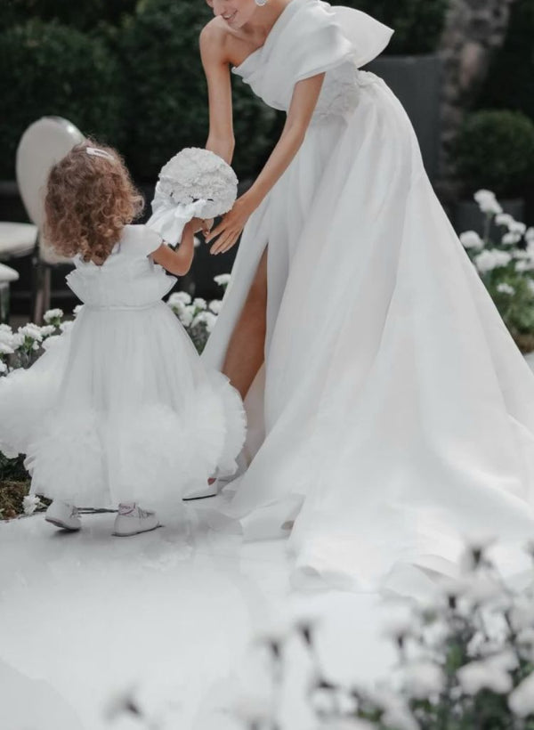 Ball-Gown One-Shoulder Sleeveless Organza Court Train Wedding Dress Featuring Bow Detail