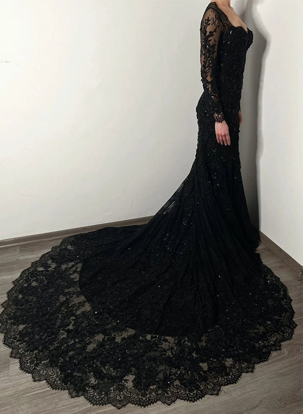 Black Lace Mermaid Fitted Wedding Dress Elegant Sweetheart Neckline Long Sleeves