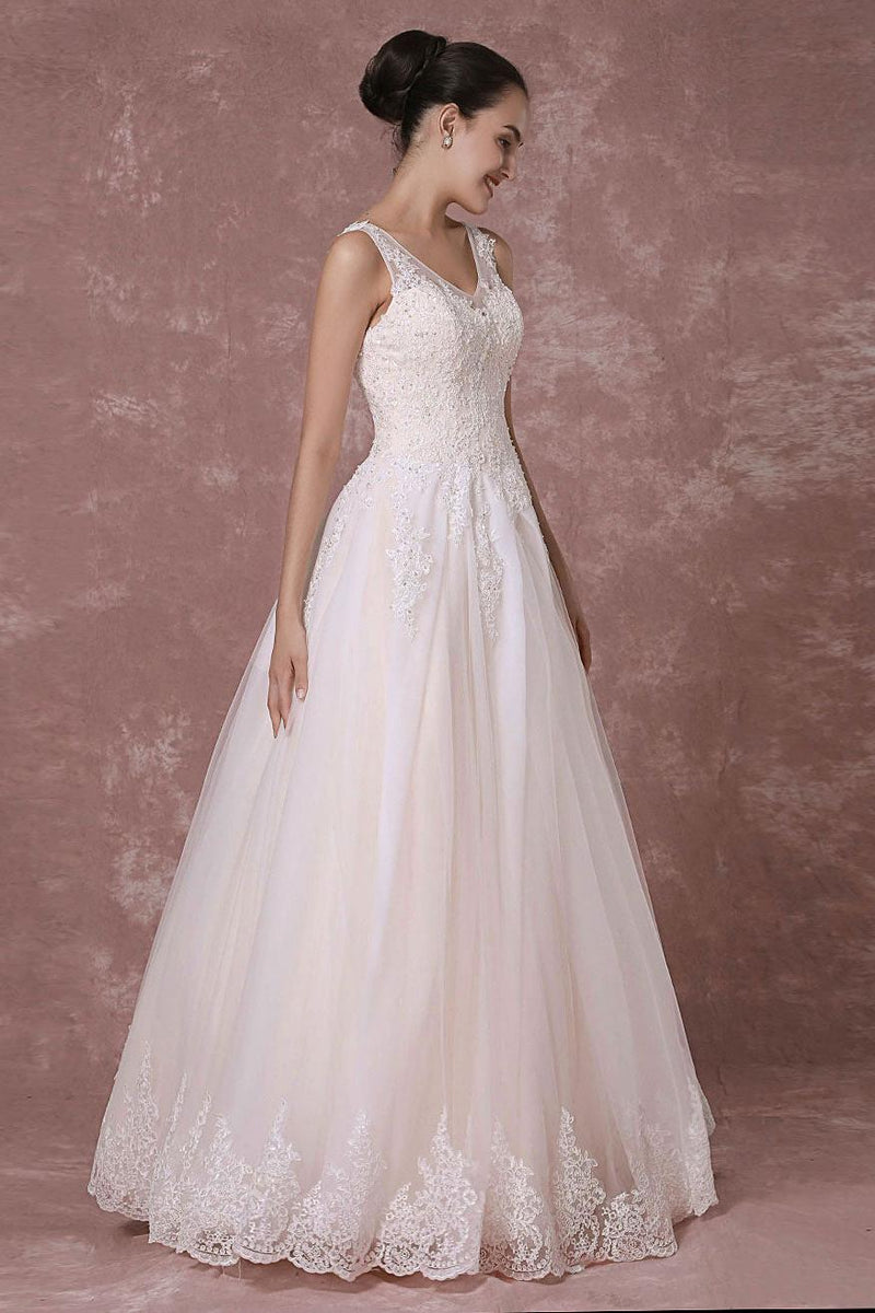 Champagne Lace Wedding Dress Sexy Backless Bridal Gown Long A-Line Beading Luxury Bridal Dress