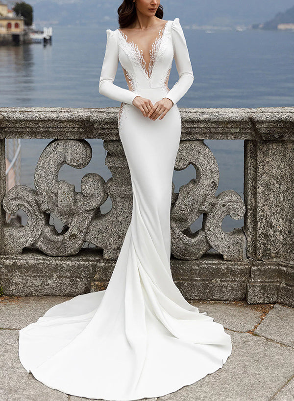 Illusion Neck Mermaid Fitted Wedding Dresses Long Sleeves Sweep Train