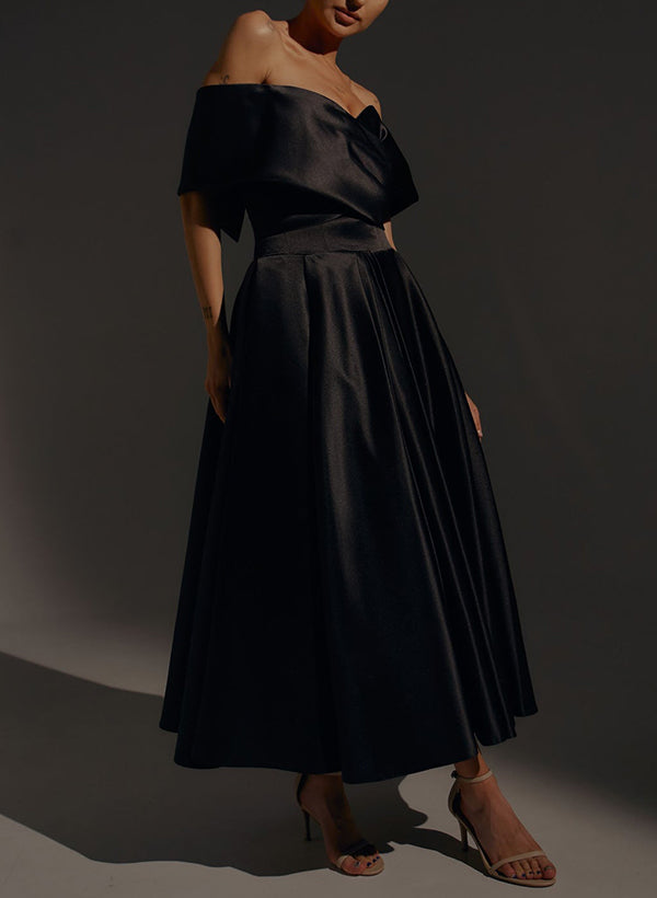 Off-The-Shoulder Sleeveless Satin Tea-Length Wedding Dress