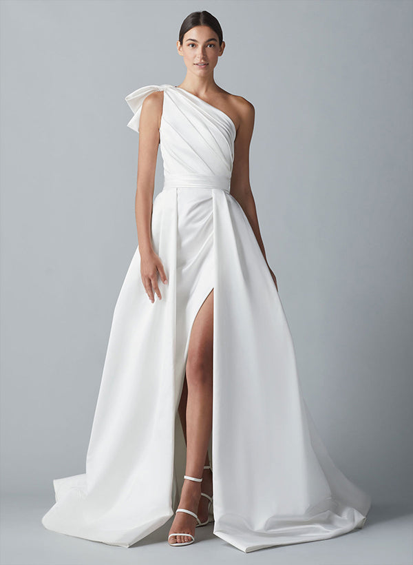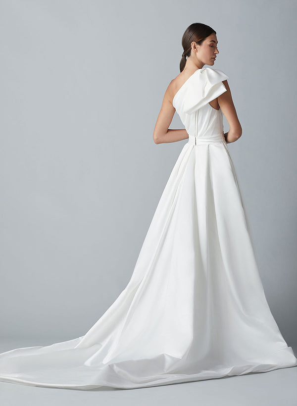 One-Shoulder Sleeveless Satin Chapel Train Wedding Dress