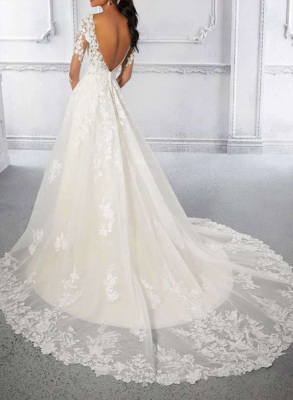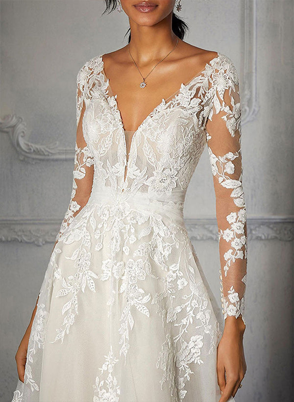 V-Neck Long Sleeves Tulle Lace Chapel Train Wedding Dress Appliques Lace