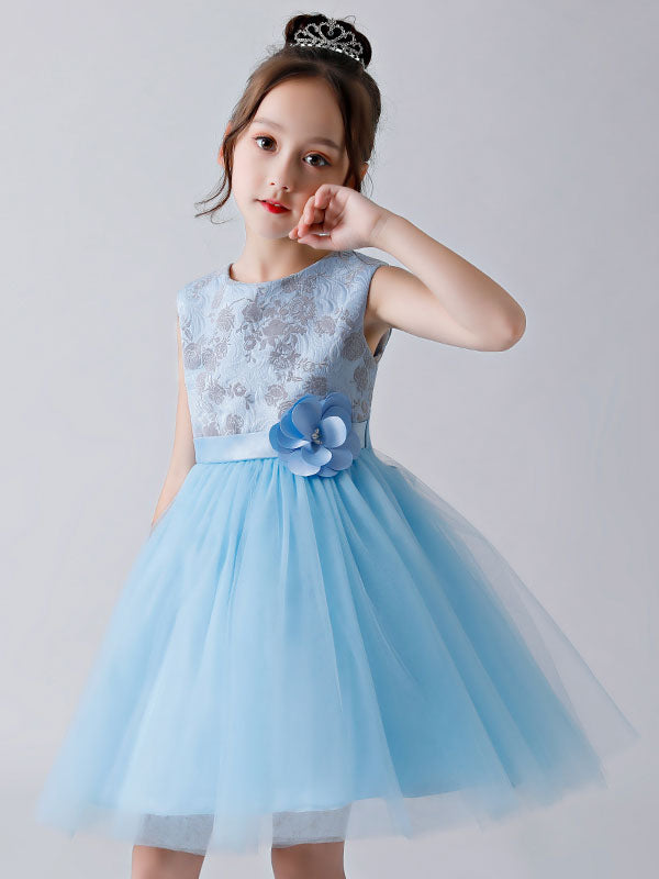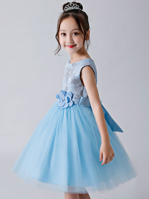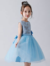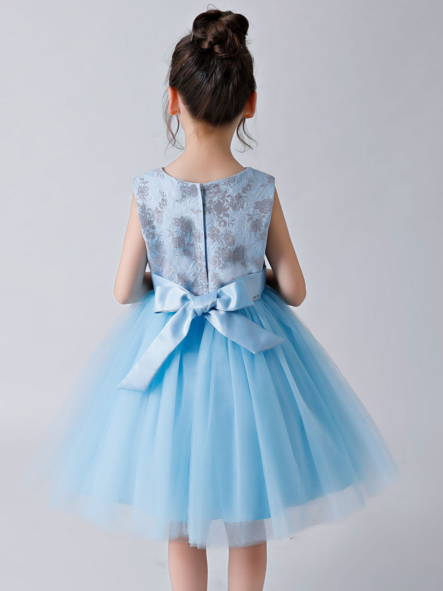Baby Blue Jewel Neck Sleeveless Bows Tulle Polyester Kids Party Dresses
