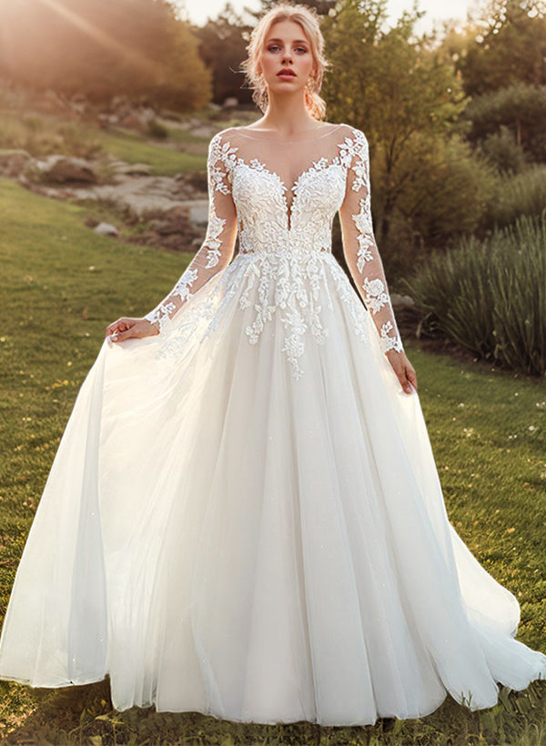 Ball-Gown Lace Wedding Dresses Romantic Tulle Long Sleeves