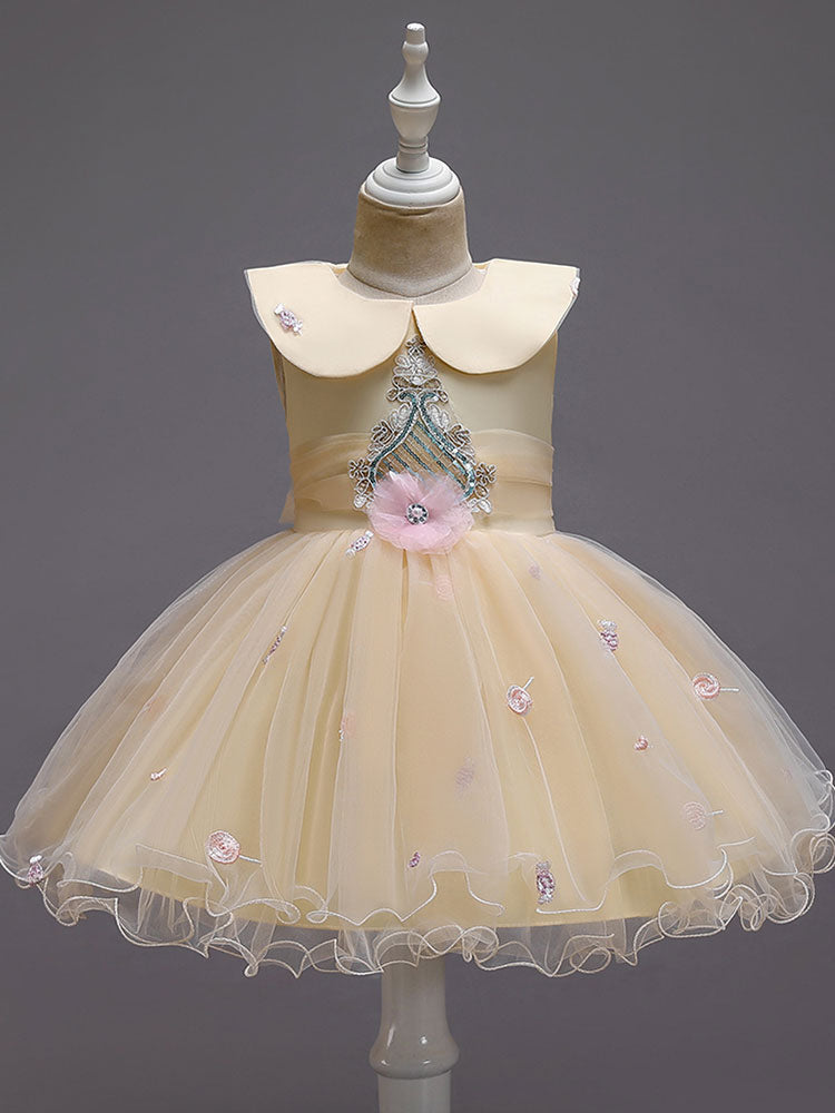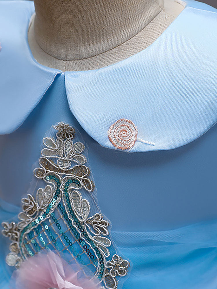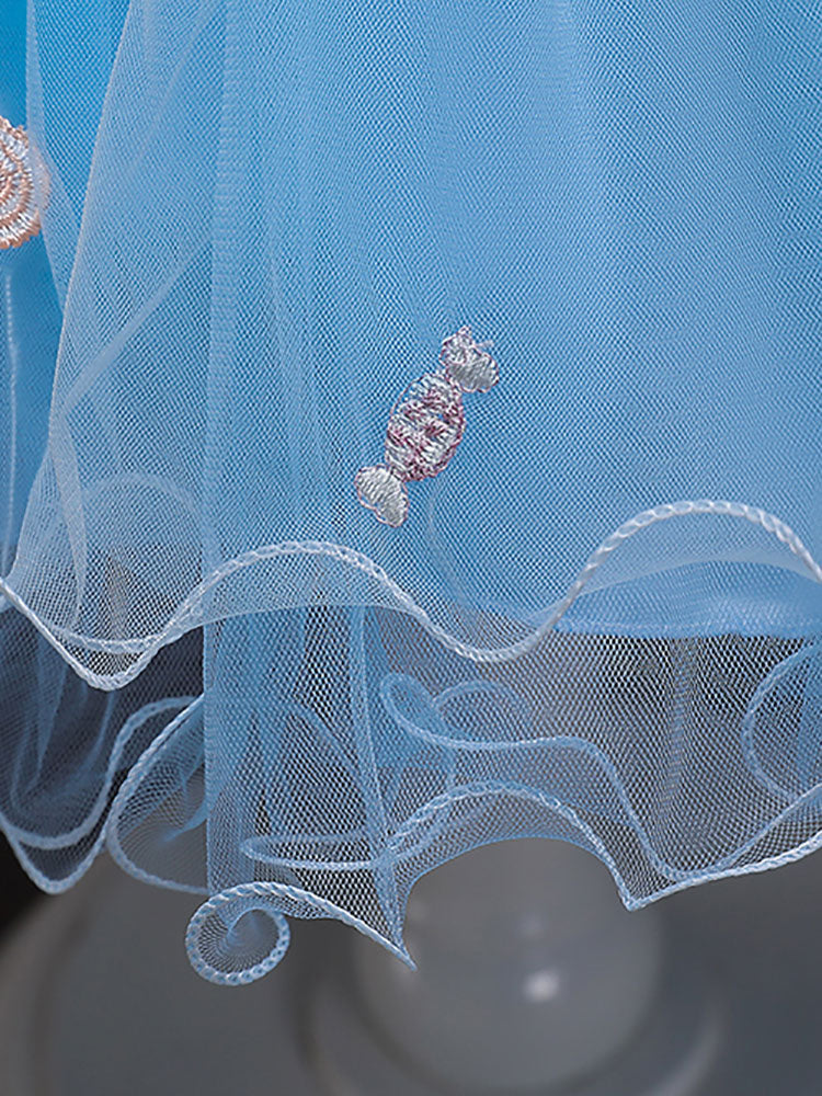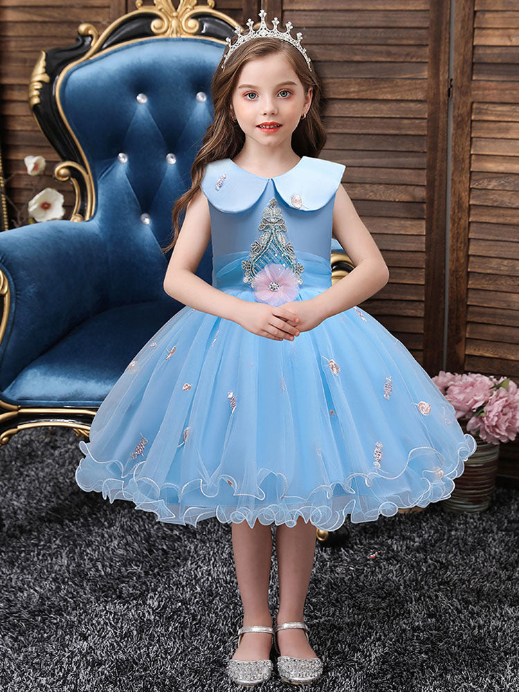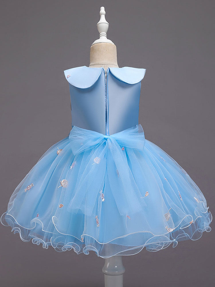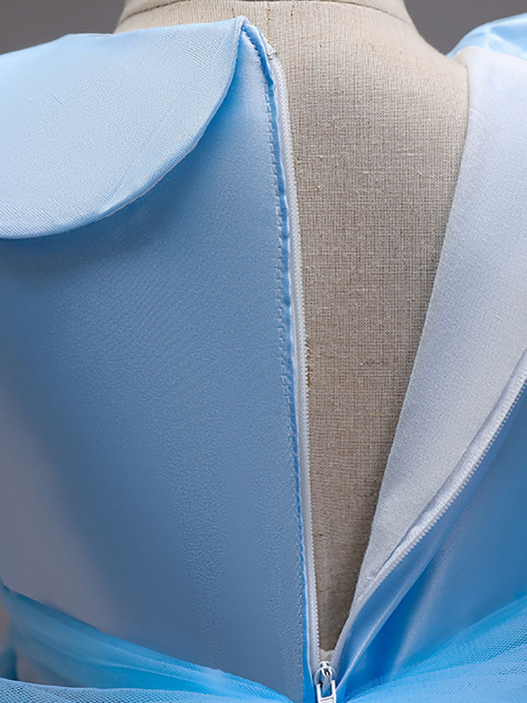 Blue Jewel Neck Sleeveless Bows Tulle Polyester Cotton Flowers Kids Social Party Dresses