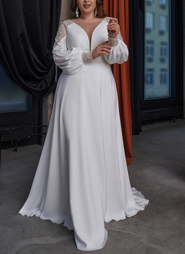 Boho Garden Chic A-line V-Neck Long Sleeves Sweep Train Lace Satin Wedding Dresses