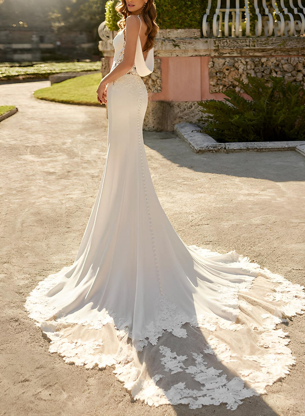 Boho Garden Mermaid Fitted V-Neck Sleeveless Court Train Wedding Dresses Lace