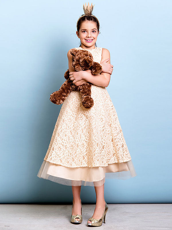 Champagne Golden Jewel Neck Sleeveless A-line Lace Kids Party Dresses