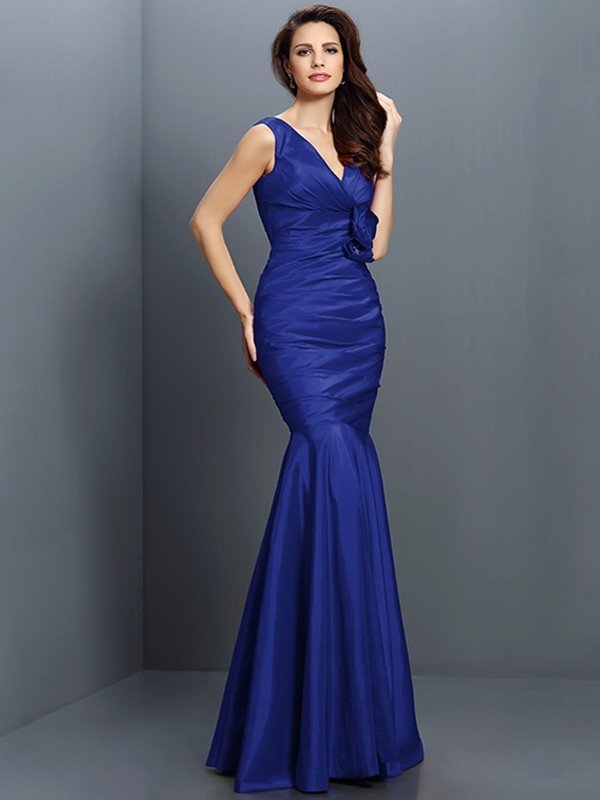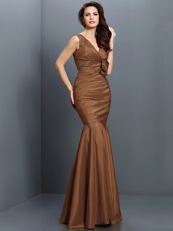 Mermaid Classy V-neck Hand-Made Flower Sleeveless Long Taffeta Bridesmaid Dresses