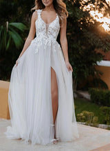 Chic A-line Tulle V-Neck Sleeveless Wedding Dress Appliques Lace