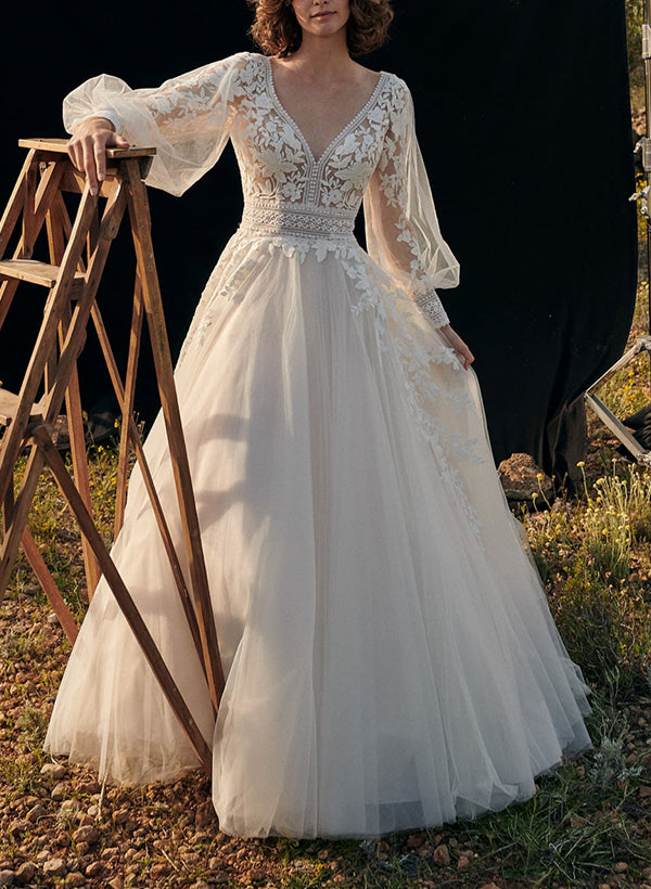 Chic A-line V-Neck Long Sleeves Lace Tulle Wedding Dresses