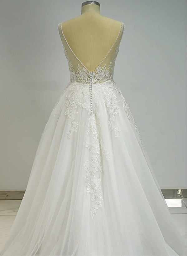 Chic A-line V Neck Sleeveless Floor-Length Tulle Wedding Dress Appliques Lace