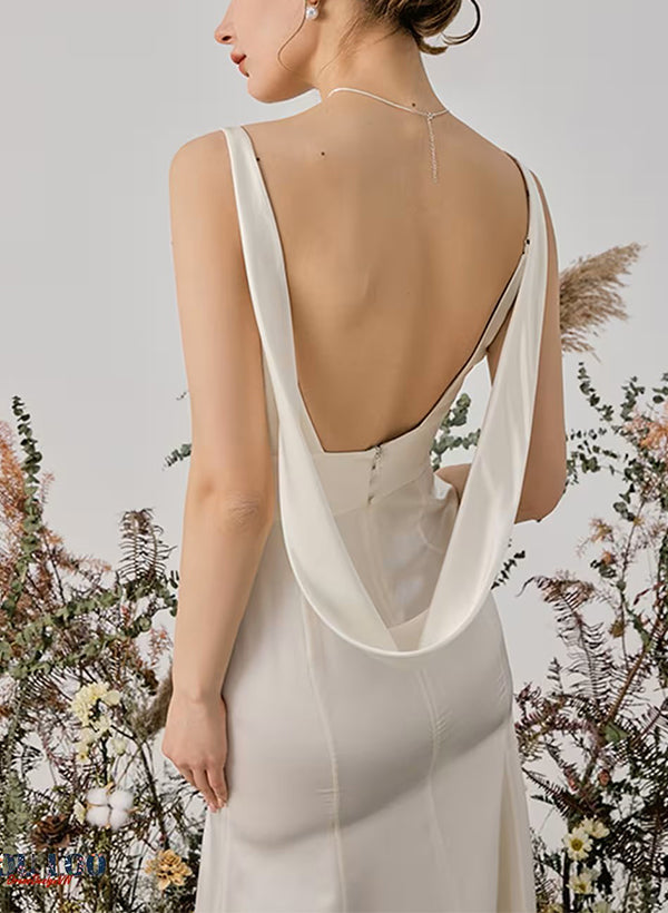 Elegant Silk Like Satin Wedding Dresses Sheath Fitted V-Neck Sleeveless