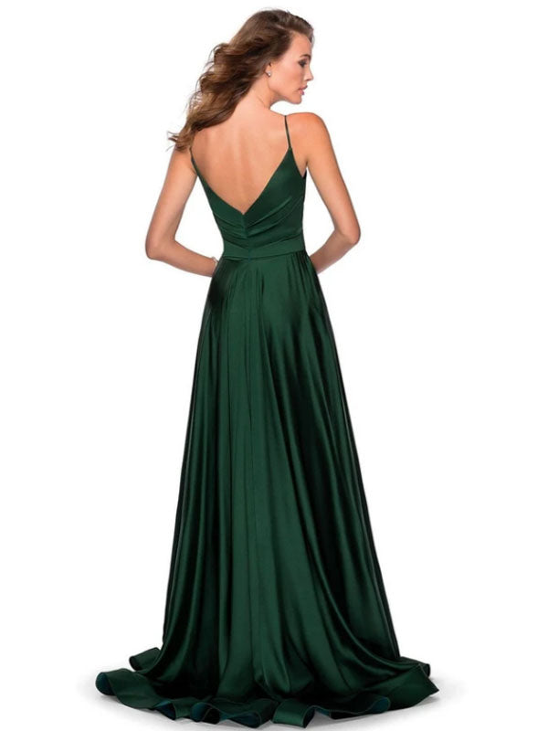 Forest Green A-Line Backless Silk Like Satin V-Neck Long Bridesmaid Dress