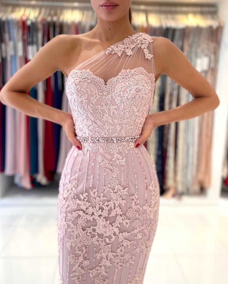 Modern Lace Sheath Prom Dress On Sale With Crystal One Shoulder