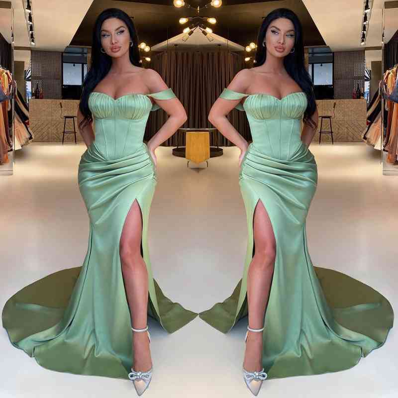 Modest Sage Green Off-the-Shoulder Prom Dresses Mermaid Slit