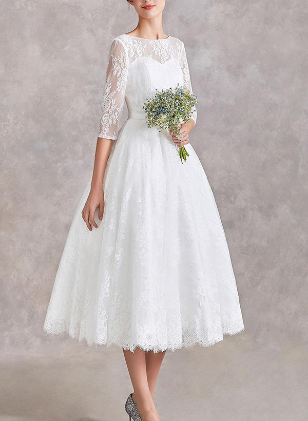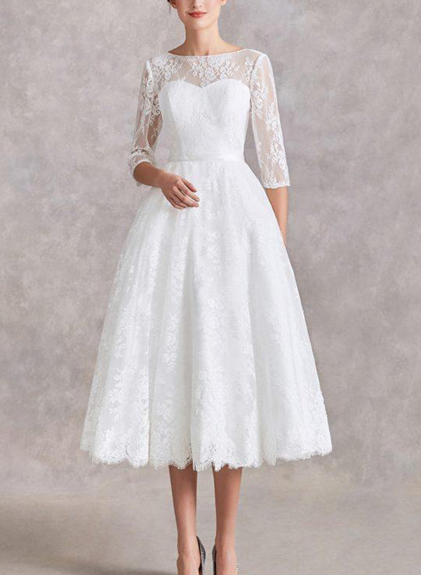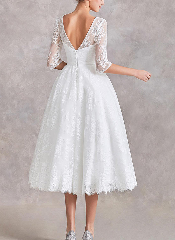 Illusion Neck Chic A-line Lace Wedding Dress Half Sleeves Tea-Length