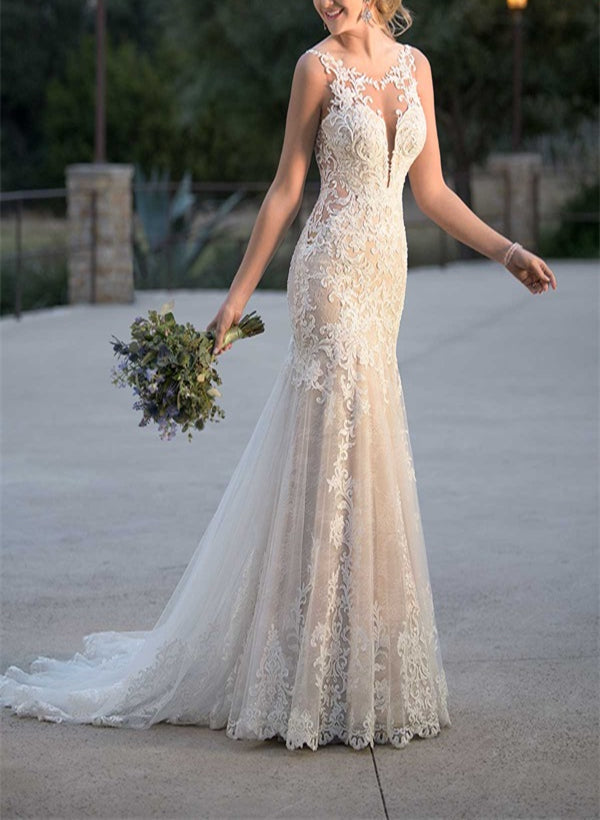 Scoop Neck Sleeveless Lace Mermaid Fitted Wedding Dress Sweep Train