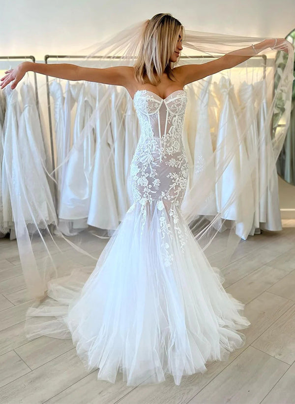 Sexy Elegant Sweetheart Mermaid Fitted Sleeveless Lace Tulle Wedding Dresses